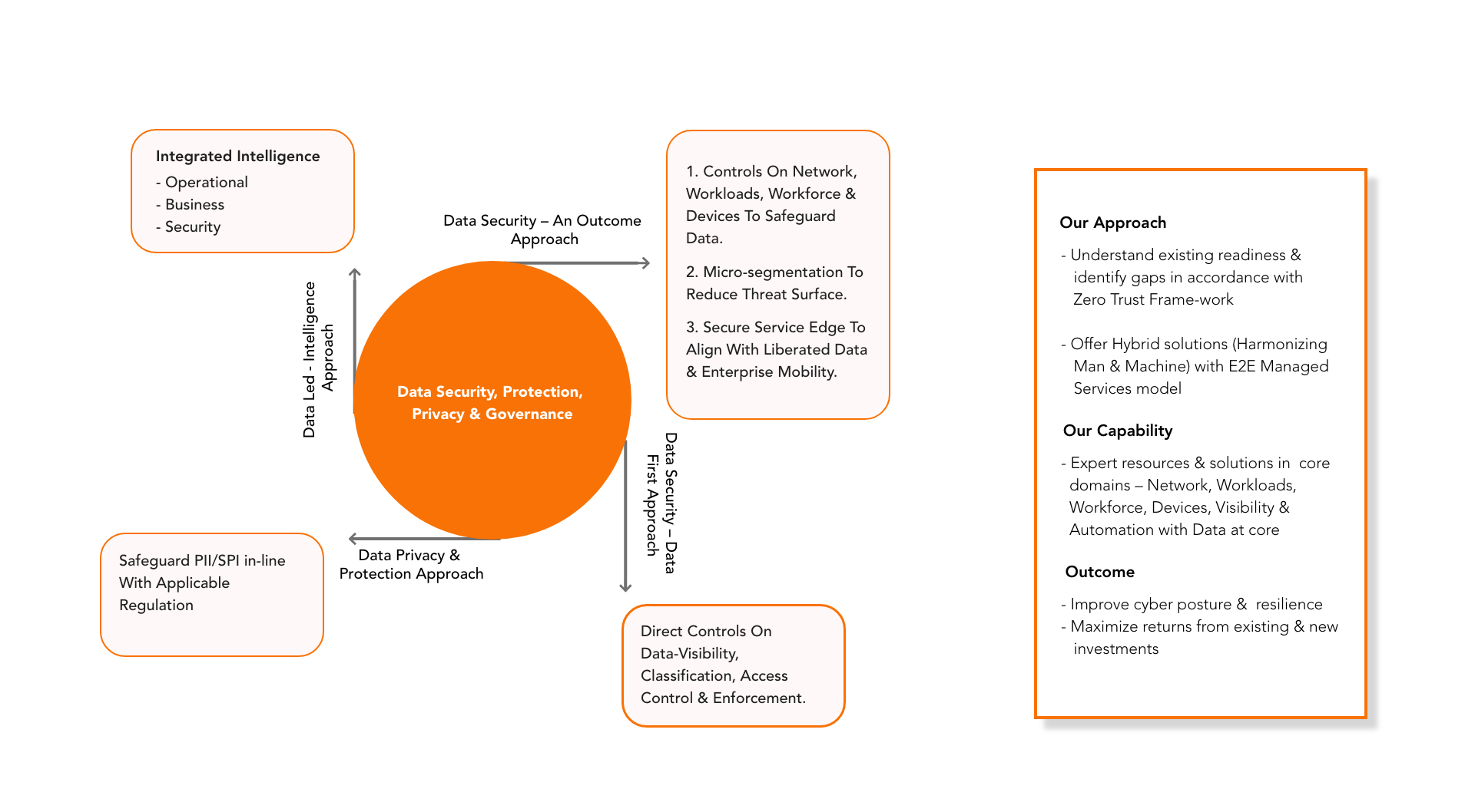 The approach kick-starts with identification & classification of sensitive Data across enterprise estate, followed by assignment of appropriate Data ownership and access control to reduce Blast Radius. The final step before continuous monitoring & anomaly detection is to enforce enterprise data polices backed with DLP, Encryption, Data masking technologies etc.